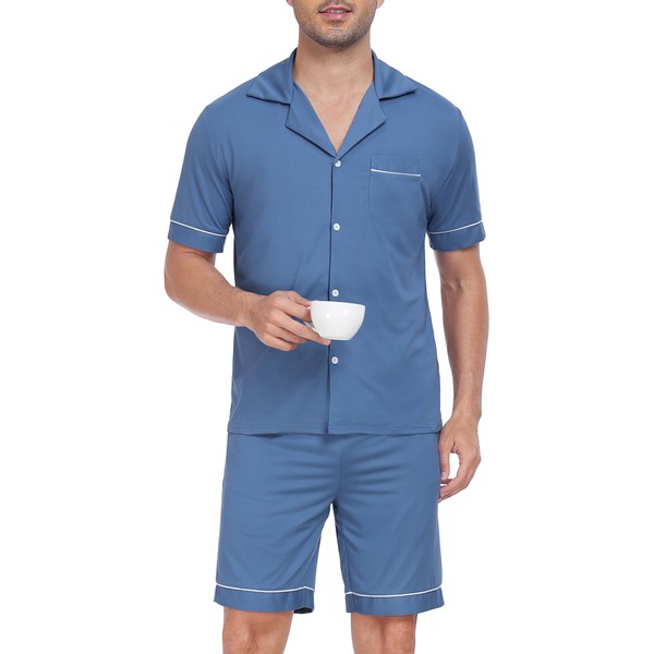 Sopesil Pyjamas for Men Cotton Shorts Sets Button Down Men's Pjs Short Sleeve Soft Sleepwear Soft Loungewear Comfy with Pockets, Blue, S