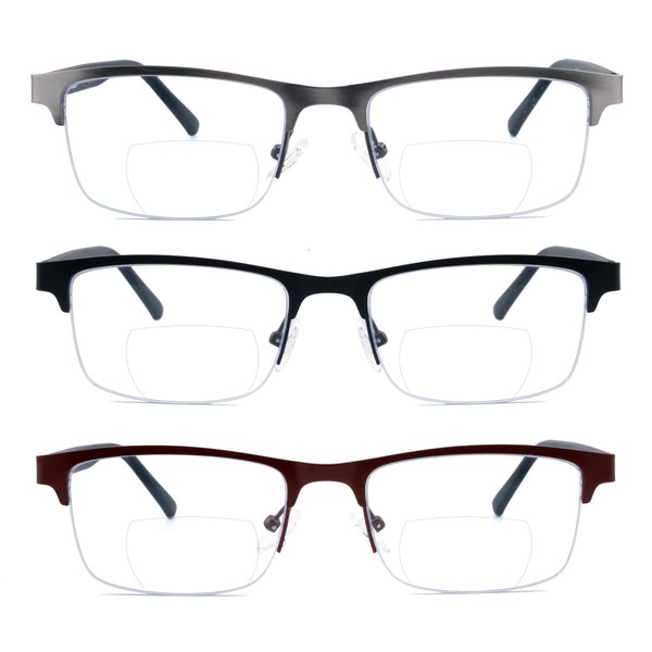 SOPHILY 3 Pack Bifocal Reading Glasses for Men Metal Half Frame Bi-focal Readers Clear Top Far/Near Dual-use Eyeglasses, +1.0