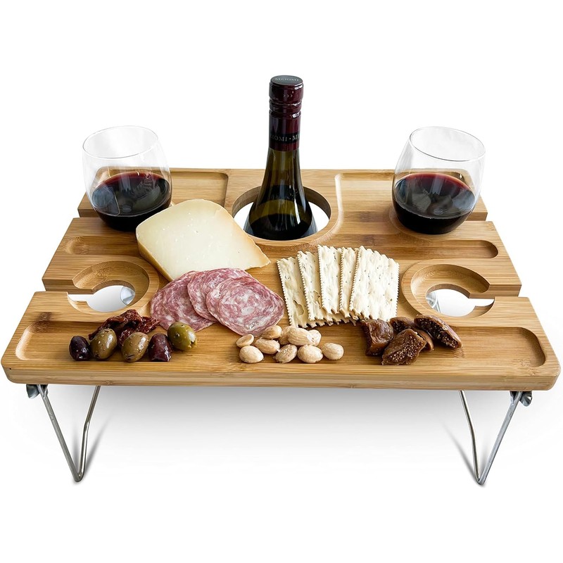 Sophisticated Scandinavian Portable Bamboo Picnic Table, Spill-Proof Holders, Perfect for Wine and Cheese Parties, Compact Foldable Design for Effortless Travel and Setup
