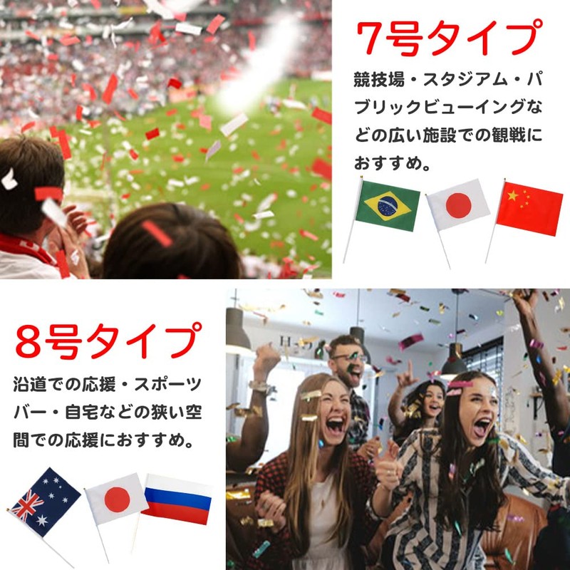 - [Uses] Size 7 is 7.9 inches (20 cm) long x 11.8 inches (30 cm) wide, and is almost A4 size. Perfect for cheering on a wide range of facilities such as stadiums, outdoor stadiums, walkways, public viewing, and more. From a distance, you can see which country flag is the nation. Size 8 is 5.5 inches (14 cm) long x 7.9 inches (20 cm) wide, and the A6 size is slightly smaller. Great for cheering on your home, sports bar, or in-house with friends