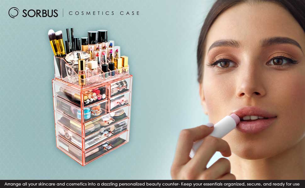Find beauty in organization with the Sorbus Acrylic Cosmetic Makeup and Jewelry Storage Case. It's pretty in pink and features acrylic construction to store your makeup and jewelry with an effortless view. Three drawers on the bottom unit are ideal for oversize cosmetics, toiletries, and grooming tools, while the top four drawers hold smaller items. It also includes 16 slots on the top portion to keep items such as brushes, lipsticks, eye pencils, and perfume bottles protected, upright, and in place. Drawers are perfect for storing palettes, foundations, bronzers, blushes, primers, powders, jewelry, accessories, keepsakes, and much more!