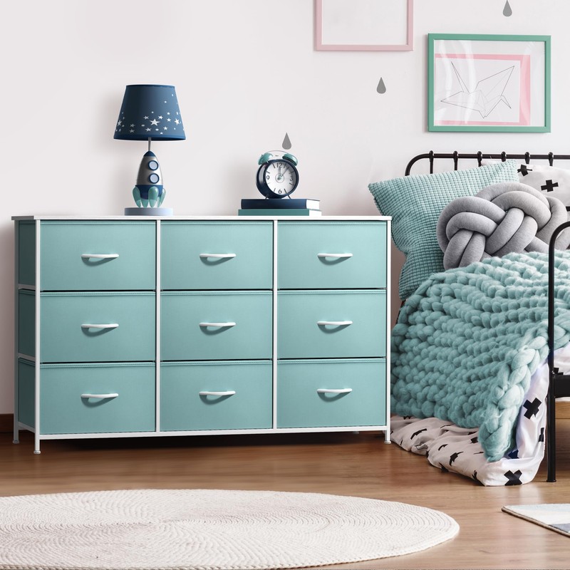 - 9-Drawer Dresser: Style meets function with this 9-drawer fabric dresser, complete with a wood top and a sturdy steel frame.