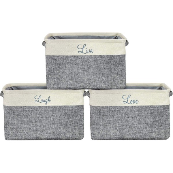 - STORAGE BASKET BINS (SET OF 3, SCRIPT) — This collapsible basket set provides attractive, lightweight storage, designed with meaningful words, "Live", "Laugh" and "Love"