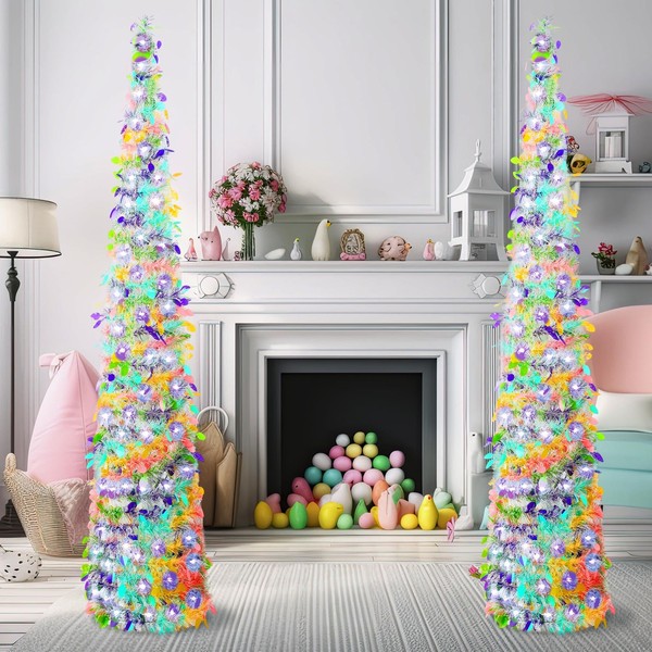Sosation 2 Pcs 5 ft LED Easter Trees Green Tinsel Pop up Artificial Pencil Trees with String Lights Collapsible for Easter Party Fireplace Home Decorations(Multicolor)