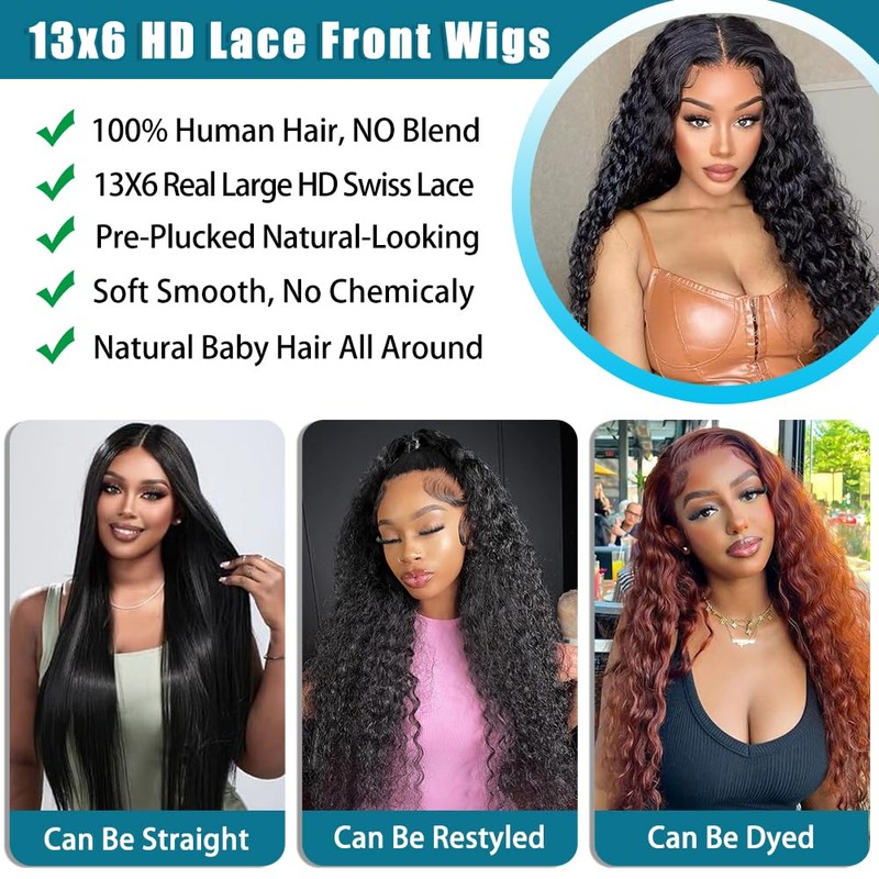 - 【13X6 HD Deep Wave Wig Human Hair Material】:Deep Wave Lace Wigs are made from Raw Materials Donated By Young Girls, Handmade with 100% Brazilian Virgin Human Hair, 100% True To Length. Healthy And Vibrant, Soft And Natural, Can Be Dyed Or Straightened