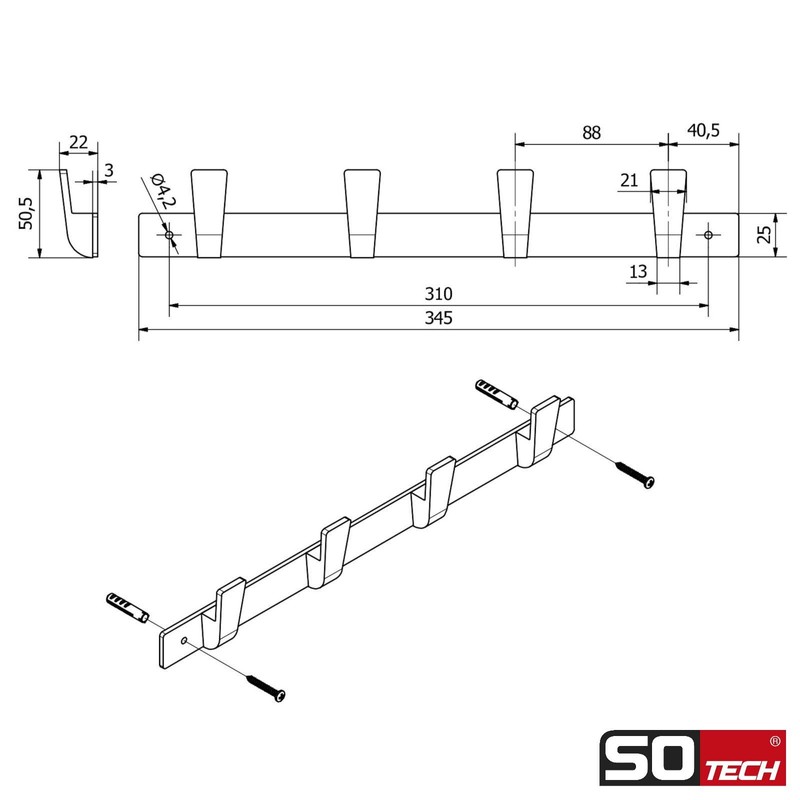 • The SOTECH Blackline ALBUS hook rail is an exclusive and elegant storage solution that should not be missing in any home. With its 4 hooks, it combines practical functionality with an aesthetic design to tidy up and visually enrich your space. The hook rack has a length of 345 mm, making it a versatile accessory for a wide range of applications - from the wardrobe in the entrance area to the bathroom to the kitchen.