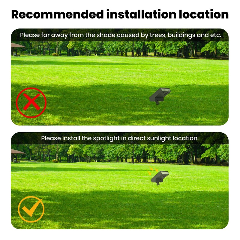 - Easy Installation: No wiring or tools required; simply adjust the angle of the solar panel to catch maximum sunlight, then stake the landscape path lights into the ground. It is recommended that loosening the soil before installation would be easier to install. After installation, this solar lawn lights can bring 9 meters wide lighting range
