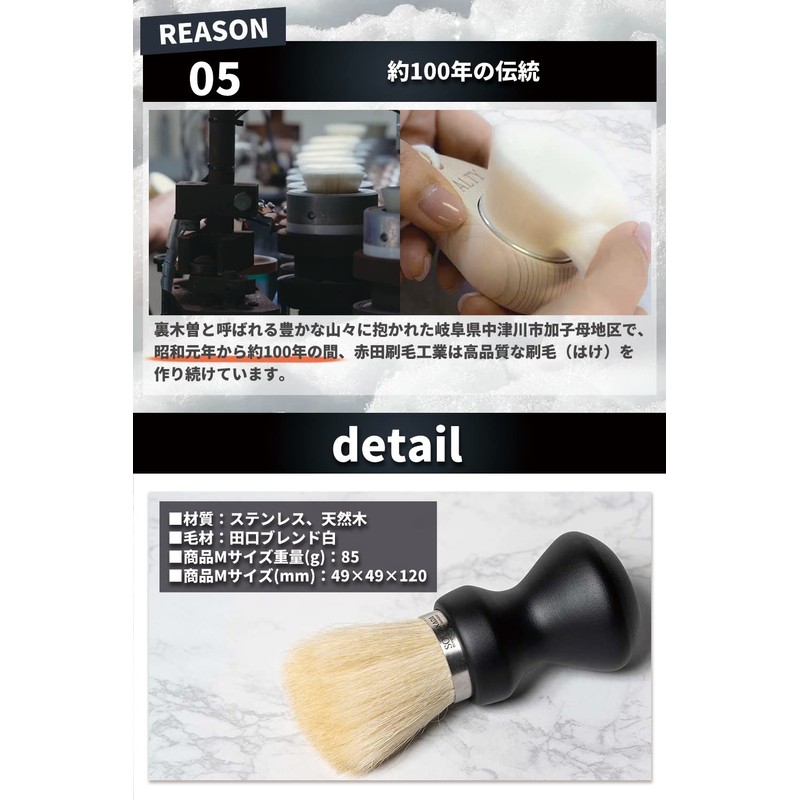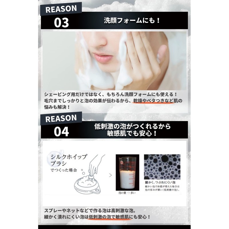 - The secret of whip brush: The hair is made of 3 different characteristics: fiber hair, goat hair, and pig hair, resulting in outstanding foaming power. Furthermore, it has fine and hypoallergenic foam that is safe for sensitive skin