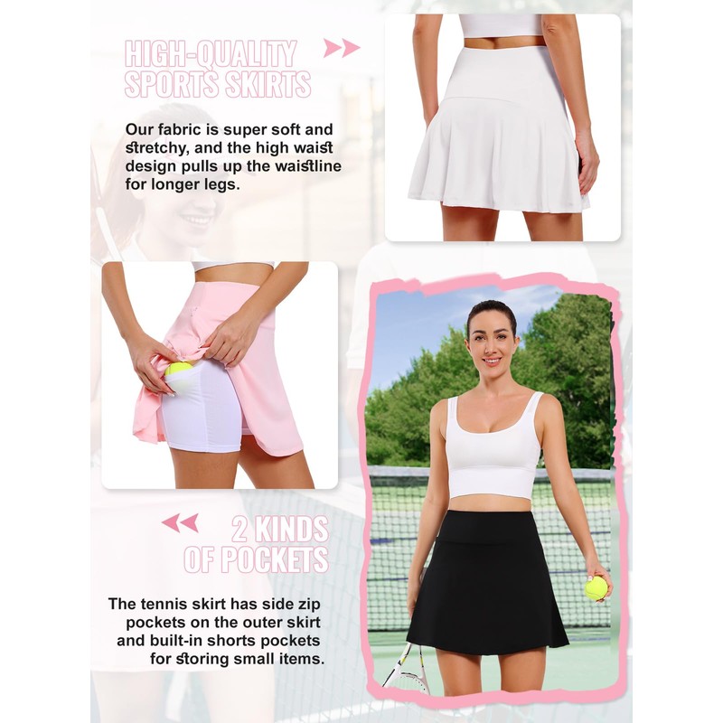 - BUILT-IN BOTTOMING SHORTS: Our golf skirt has built-in comfortable bottoming shorts that provide extra coverage and protection, and the shorts are designed with 2 pockets for storing tennis balls or other small items.