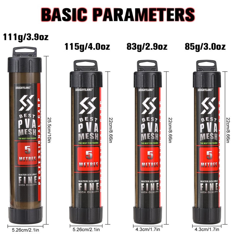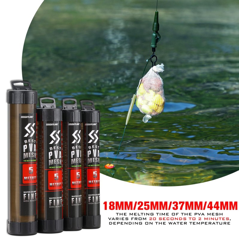 - 5M Pva Mesh Bag - Available in four sizes of 18 mm, 25 mm, 37 mm, 44 mm, the tube itself has a dense anti-ladder net structure, and the expanded funnel loader makes loading the bait quick and easy and reduces spills. It helps anglers load the bait quickly into the fishing rod.