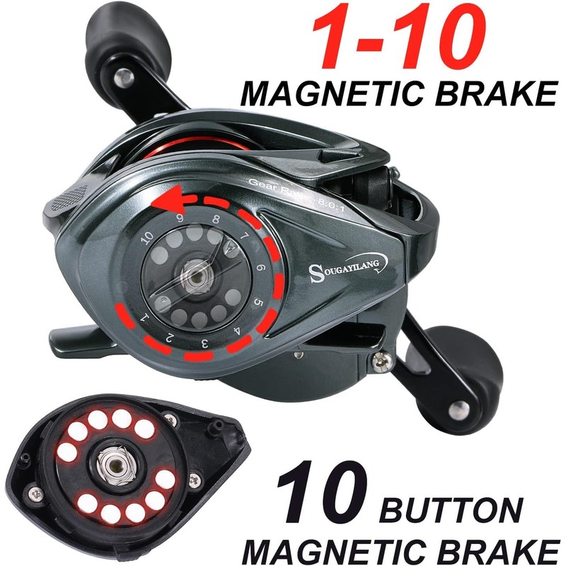 - Lightweight – Weighs 7.2 ounces, the Sougayilang Baitcasting Reel has a super lightweight graphite frame that is ultra-light and ultra-powerful. The compact size low-profile baitccaster reel is ergonomically designed for comfort.