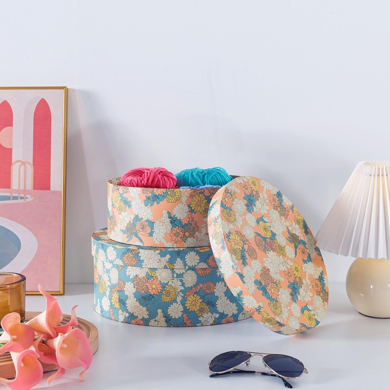 - FEMININE FLORAL BLOOMS ARE ALWAYS IN SEASON—An elegant floral pattern in lovely shades of apricot and teal gives these charming oval boxes their irresisible beauty. They would look fabulous on an open shelf to contain scarves or to keep family keepsakes safe. Both boxes feature a matching floral pattern.
