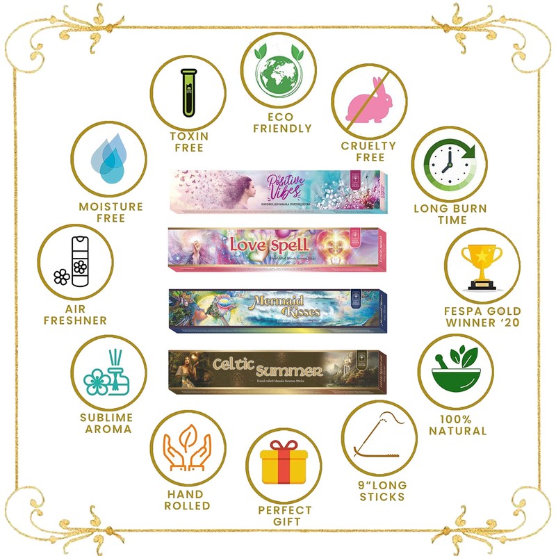 - MEDIEVAL MAGIC: 4 pack includes Mermaid Kisses, Love Spell, Positive Vibes and Celtic Summer