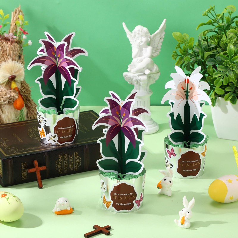 • Effortless DIY Process: start by tearing waste paper into strips and filling the paper holder; Next, cross the lily card and insert it into the flower pot; Finish by adorning the flower pot with stickers; This simple yet engaging process is suitable for adding a touch of religious charm to your Easter decor