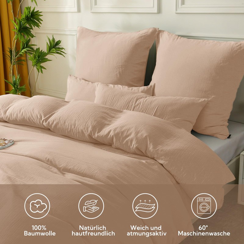 SOULFUL Double Muslin Bed Linen 135 x 200 cm Cotton, Bed Linen Sets 1 Duvet Cover with 1 Pillowcase 80 x 80 cm, Oeko-Tex Bed Linen Apricot Brown with Zip
