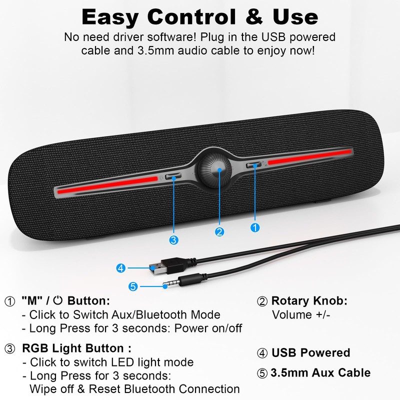 - 【AUX MODE】Just plug into the USB port for power, the 3.5mm jack for audio. Press the "M" button to switch to "Aux Mode" and adjust the volume +/- with rotate button on the computer speakers