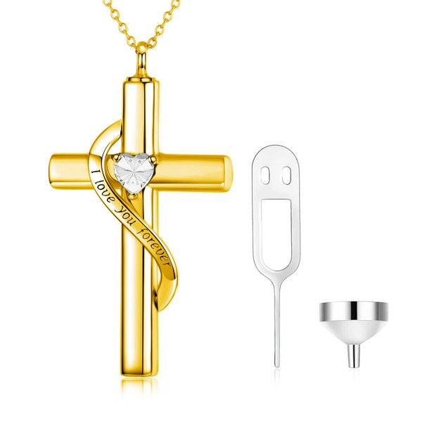 SOULMEET Crystal Cross Necklace for Ashes, Sterling Silver I Love You Forever Birthstone Cross Urn Necklaces for Ashes Keepsake Cremation Jewellery for Pet Human Ashes, Cubic Zirconia