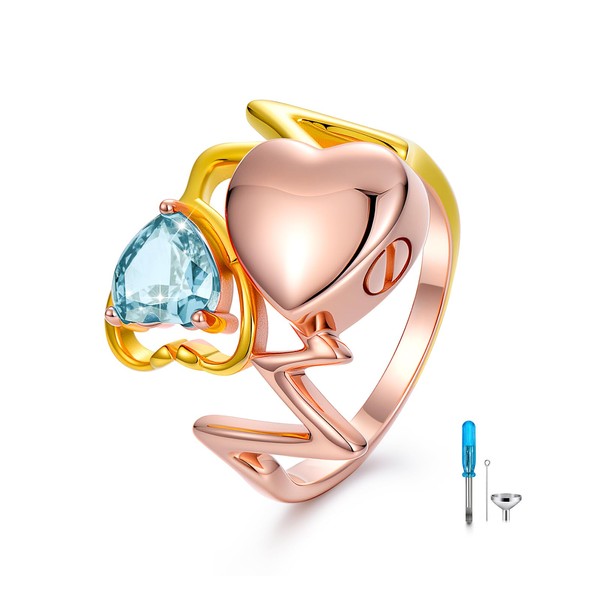 - [Material]: This urn ring is made of two tones gold and rose gold plated silver. Craftsmanship 5A crushed ice cut simulated diamond birthstone March. Comes with tools to put ashes. Hypoallergenic allows for comfortable wear, especially for those with sensitive skin.