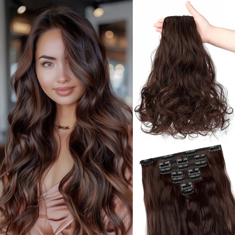 Soulwigger Clip in Hair Extensions, 22 Inch 6 PCS Natural Curly Soft Synthetic Hair Extensions Clip ins, Medium Brown Long Wavy Hairpiece for Women