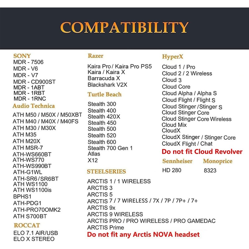 - 🎧COMPATIBLE WITH: Our ear pads fit many brands of headphones, such as ATH-M50x, ATH M40x, ATH-M30x, ATH M50, Cloud 1/2/Core/Mix/Alpha, arctis 7, arctis 7P, arctis 9, arctis 9x, arctis pro, arctis pro wireless, MDR-7506, MDR V6, stealth 500, stealth 600, stealth 700 and so on. We show all the compatible models in the list for your reference.