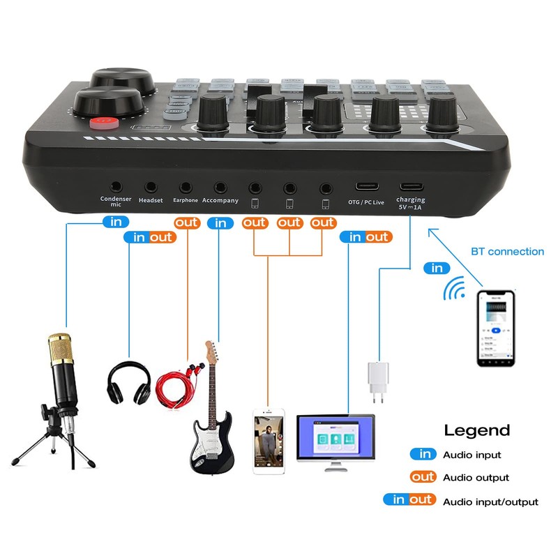 - REAL TIME STREAMING TRANSMISSION: Sound mixer streams in real time while charging, eliminating the need to switch cables. When plugged in, the phone and sound card can be charged simultaneously to meet the needs of long term live streaming. Charging 5V 1A, OTG, computer.