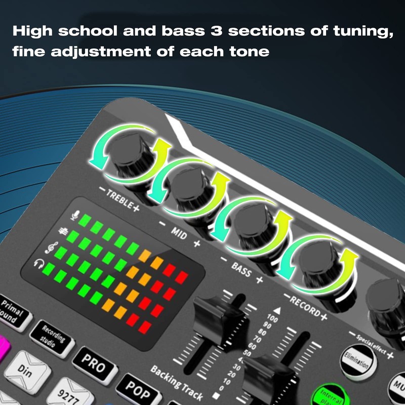 - PERSONALIZED ELECTRONIC TUNING: Sound mixer has personalized electronic tuning to choose the beautiful sound that suits you, so you can make highs and lows during the live broadcast. The higher the treble, the sharper the sound, the higher the bass, the clearer the sound.