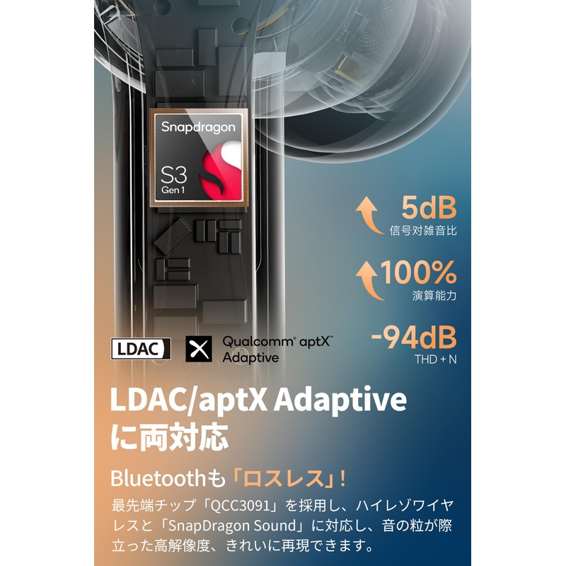 - Sound quality is top priority! Lossless Wireless Experience Beyond CDs: Compatible with Qualcomm Snapdragon Sound platform, which is the latest and best technology solution. It improves sound quality, connection stability, delay, call quality, and other performance that is important to audio. The codec "aptX Adaptive" automatically adjusts the bit rate according to the communication status, allowing you to achieve the optimal audio experience depending on the situation, and also transmits data rates of up to 96 kHz/24 bits. In addition, it supports lossless codec "aptX Lossless" and has a CD-quality 44.1 kHz/16 bit lossless playback. Experience premium sound in all sources and situations including music, videos, games, and more. Requires pairing with Snapdragon Sound enabled devices