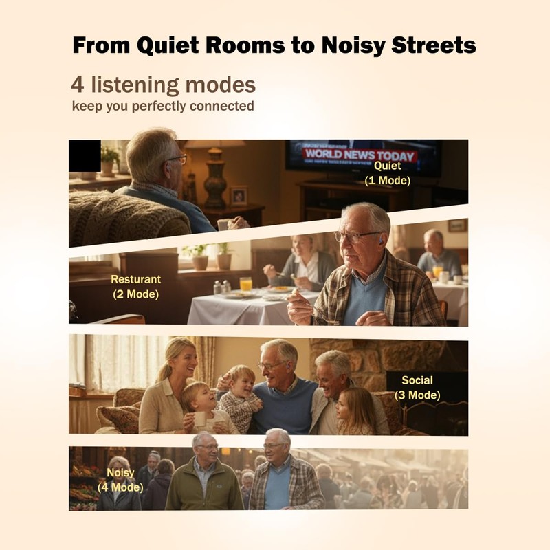 - Smart OTC Functionality: Simple OTC hearing aids with four listening modes let you adapt to quiet, noisy, and outdoor environments. Suitable for everyday use or as hearing aids for severe hearing loss, they offer versatile performance.