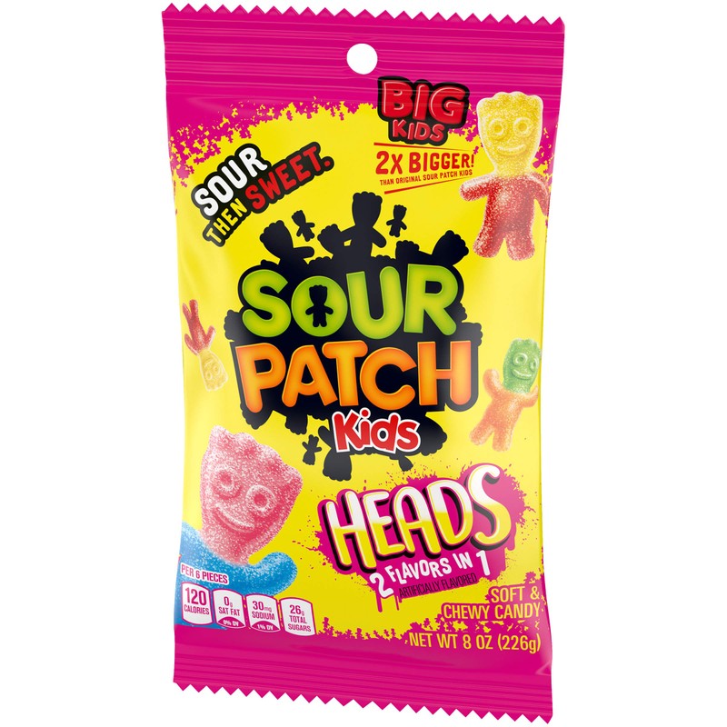 - This bulk package contains 12 individual 8 oz. bags of BIG SOUR PATCH KIDS Heads Candy, which have fun flavor combos like Pink Lemonade–Blue Raspberry, Pineapple-Red Berry, and Peach-Orange