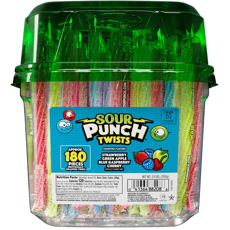 - Individually wrapped in this 3.9-Pound tub, this assortment of sour Punch twists candy comes in the perfect pack for passing out treats, whether at home or at the office.