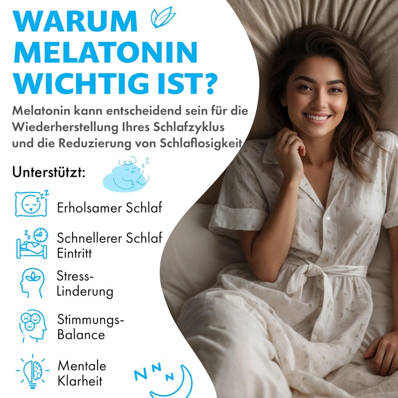 - 🍀 100% NATURAL PRODUCT - Melatonin is a hormone that is naturally produced by the body and is important for regulating the sleep-wake rhythm. Modern factors such as stress, blue light and irregular daily routines can disrupt melatonin production. Taking melatonin supports healthy sleep patterns and promotes restful nights, especially for people with insufficient natural sleep production.
