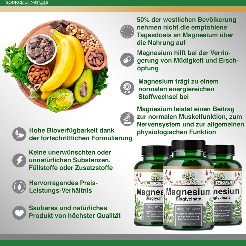 - 100% natural product: magnesium is an essential mineral that is naturally found in vegetables such as spinach, nuts and seeds. It plays an important role in more than 300 enzymatic processes that regulate countless biochemical functions throughout the body, and is an essential cofactor. Recent studies show that 50% of the western population does not absorb enough magnesium through food
