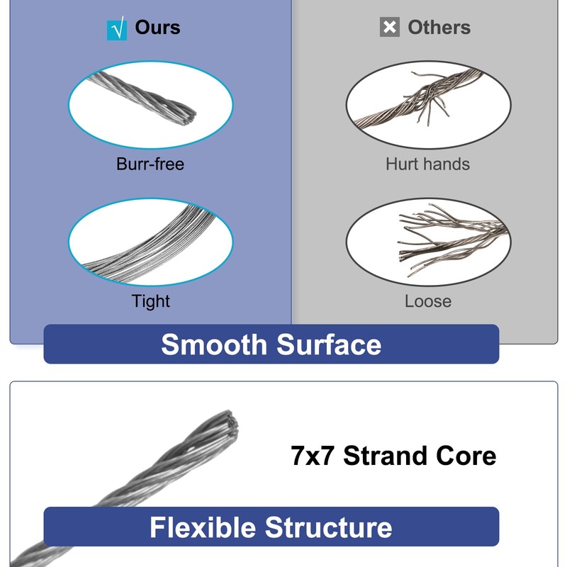 - 304 Grade Stainless Steel - The wire rope is made of 304 stainless steel, rust-proof and durable, with high tensile strength, good mechanical properties, and both strength and flexibility, suitable for long-term use indoors and outdoors.