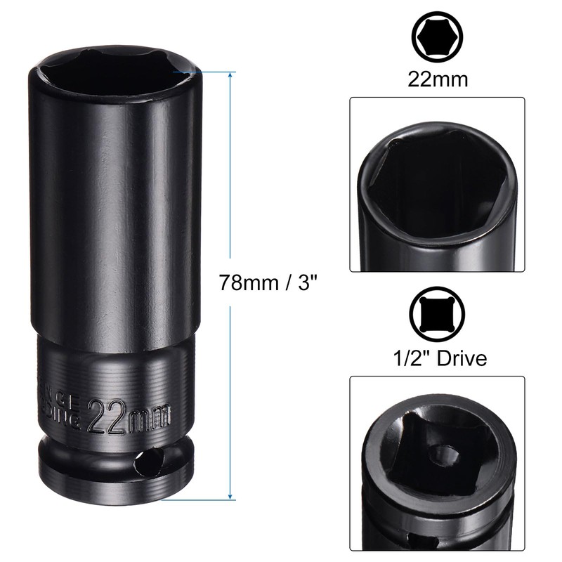 - Drive Socket & Adapter Set Size: 6-Point Socket: size: 22mm, square drive: 1/2", total length: 78mm / 3"; Socket Adapter: hex shank: 1/4"; square drive: 1/2"; total length: 73mm / 2.87". Tool set are made from CR-V (chrome vanadium) steel for high strength, durability, wear resistance, and corrosion resistance.