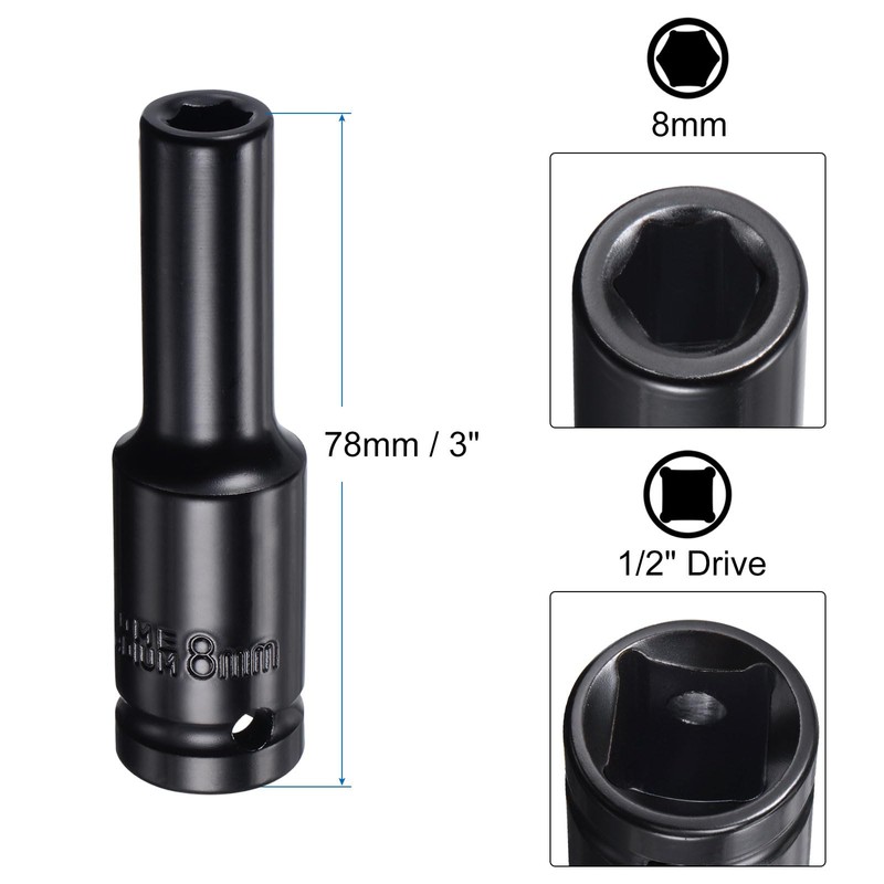- Drive Socket & Adapter Set Size: 6-Point Socket: size: 8mm, square drive: 1/2", total length: 78mm / 3"; Socket Adapter: hex shank: 1/4"; square drive: 1/2"; total length: 73mm / 2.87". Tool set are made from CR-V (chrome vanadium) steel for high strength, durability, wear resistance, and corrosion resistance.