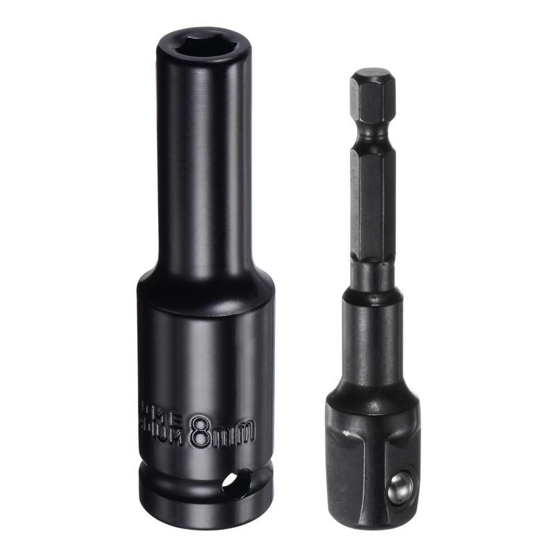 - Drive Socket & Adapter Set Size: 6-Point Socket: size: 8mm, square drive: 1/2", total length: 78mm / 3"; Socket Adapter: hex shank: 1/4"; square drive: 1/2"; total length: 73mm / 2.87". Tool set are made from CR-V (chrome vanadium) steel for high strength, durability, wear resistance, and corrosion resistance.