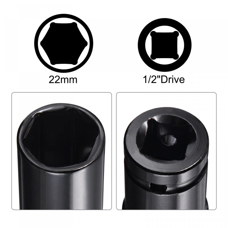 - [Included] - 1/2" drive 22mm 6-point socket, 3" total length; 1/4" hex shank, 2.87" length socket adapter.
