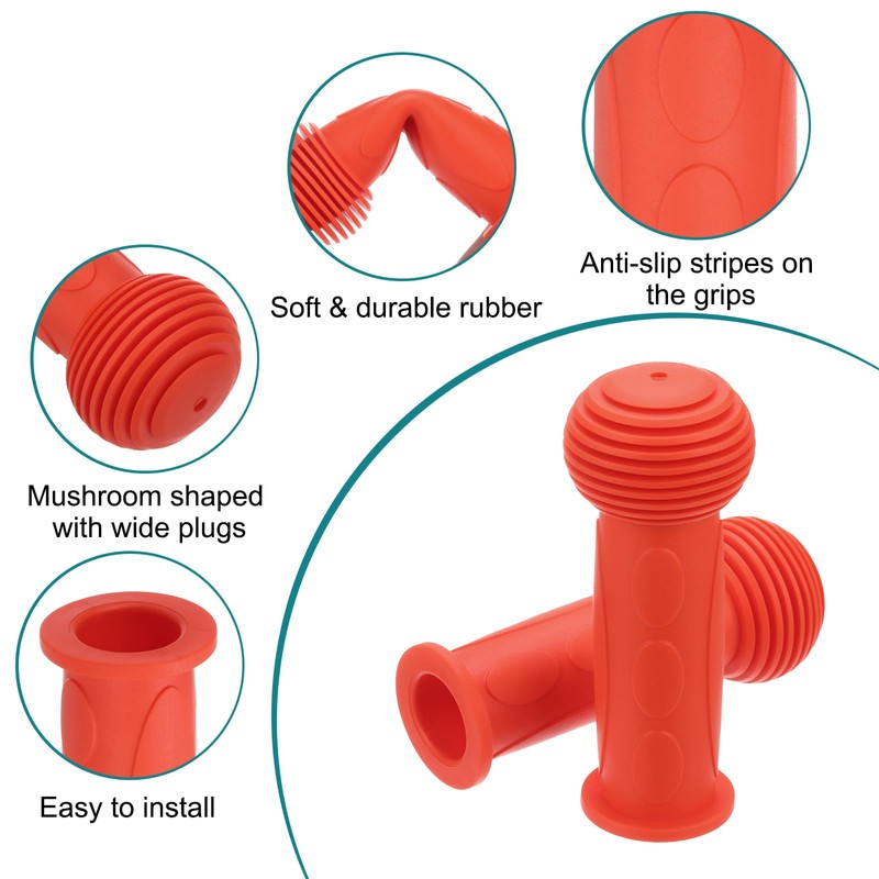 - Feature - Mushroom shaped grips with extra wide end plugs, this design keeps your child's hands on the bike or scooter handlebars at all times without slipping off without any cushioning. This is true even when it's raining or sweating.