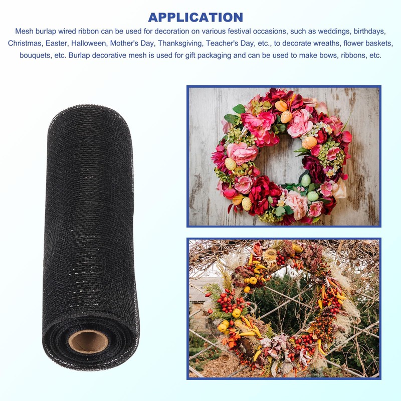 - Poly burlap mesh decorative mesh ribbon roll, applied to decorative flower mesh and gift wrapping. Mesh burlap wired ribbon can be used for decoration on various festival occasions, such as weddings, birthdays, Christmas, Easter, Halloween, Mother's Day, Thanksgiving, Teacher's Day, Anniversary, Engagement, Father's Day, New Year, Valentine's Day,etc., to decorate wreaths, flower baskets, bouquets, etc. Burlap decorative mesh is used for gift packaging and can be used to make bows, ribbons, etc.