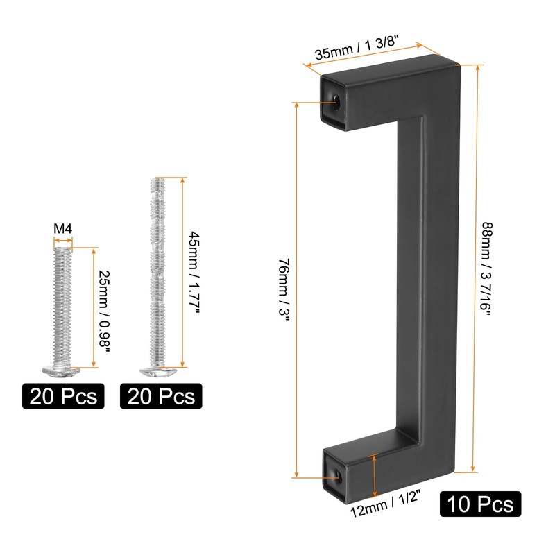 - [What You Get] - Package content comes with 10 pieces of square bar drawer handles, with Screw-hole Center: 4 inch(102mm), Overall Length: 4 1/2 inch(114mm), Width: 1/2 inch (12mm), Height: 1 3/8 inch(35mm). Please measure your size carefully before purchasing.