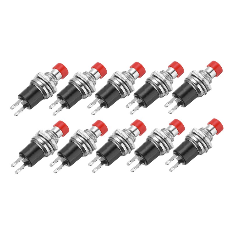 • Product Name: Mini Push Button Switch; Shell material: Stainless Steel; Button Material:Nylon; Mounting size: 7mm/0.28 Inch; Total size:9.5mm x 27mm/0.37 x 1.06 Inch; Pin number: 2P; Pin Length:6mm; Pin pitch:3mm Switch Type: PBS-110; Poles : SPST; Action Type: Momentary; Rated Current: 1A; Rated Voltage:250V AC; Contact Type: NO; Button Color: Red; Package Content:10 Pcs Push Button Switch; Thin Nut + Spring Washer