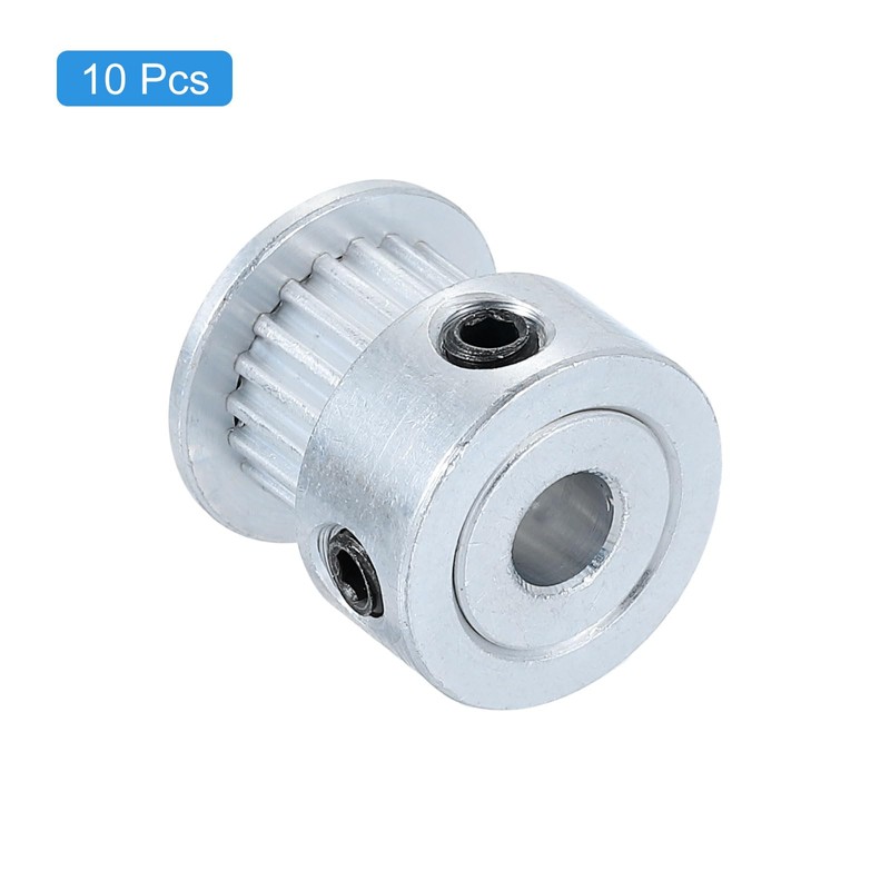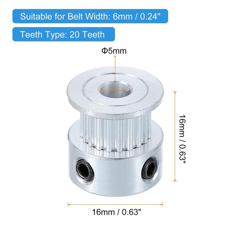 - [Idler Pulley] Material: Aluminum Alloy; Color: Silver; Teeth Type: 20 Teeth; Bore: 5mm; Suitable for Belt Width: 6mm/0.24inch; Overall Size: 16x16mm/0.63x0.63inch(OD*T); Package Content: 10pcs x Pulley; 2pcs x Screws
