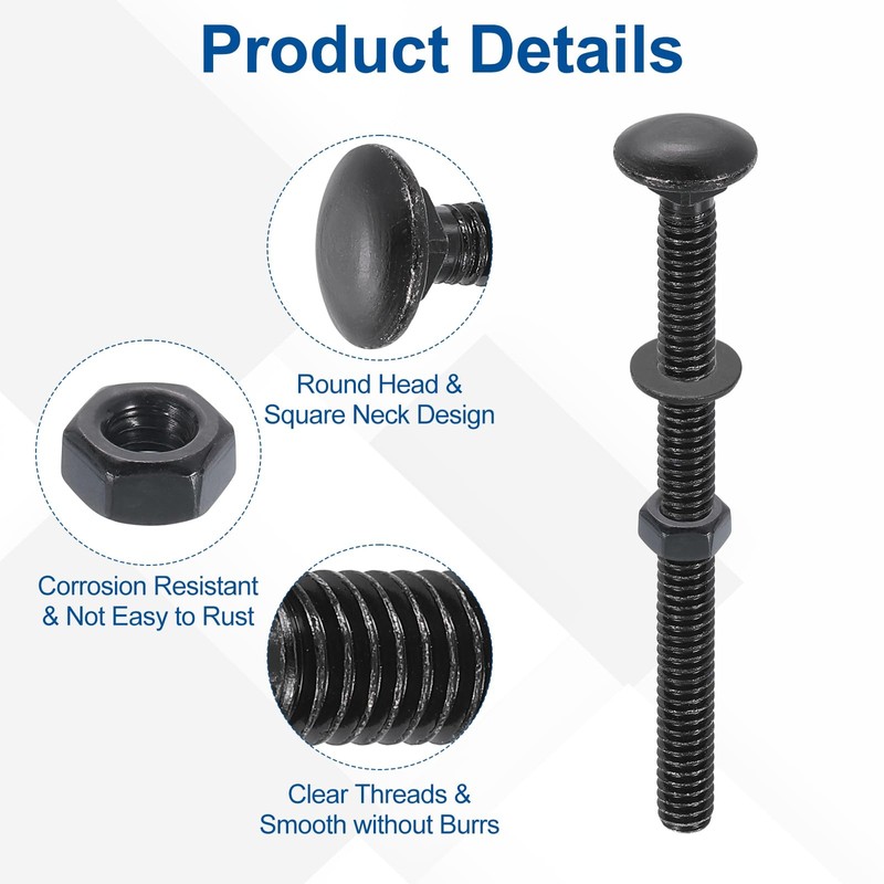 [Wide Application] - Carriage bolt sets are used to fix metal to wood. Widely used in homes and offices, both indoors and outdoors, such as securing headboards, footboards, doors, bed frames, furniture, TV, engineering, or other DIY projects.