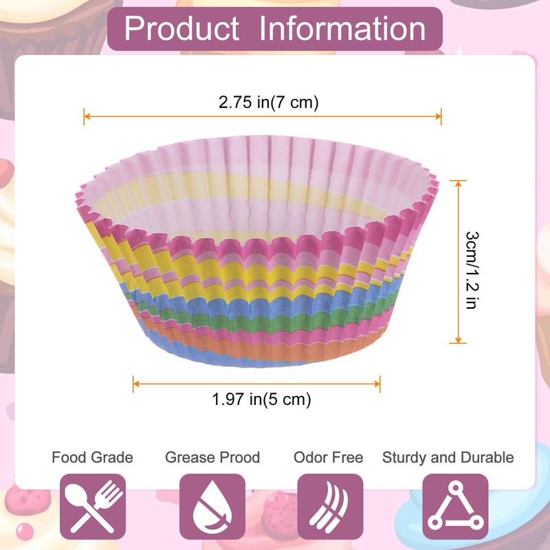 - Application - With cute bright colors, cupcake wrappers are suitable for serving cakes, cookies, muffins, candies, nuts, pastries, ice cream and other treats, which can make your desserts, cookies and pastries more attractive and impressive.
