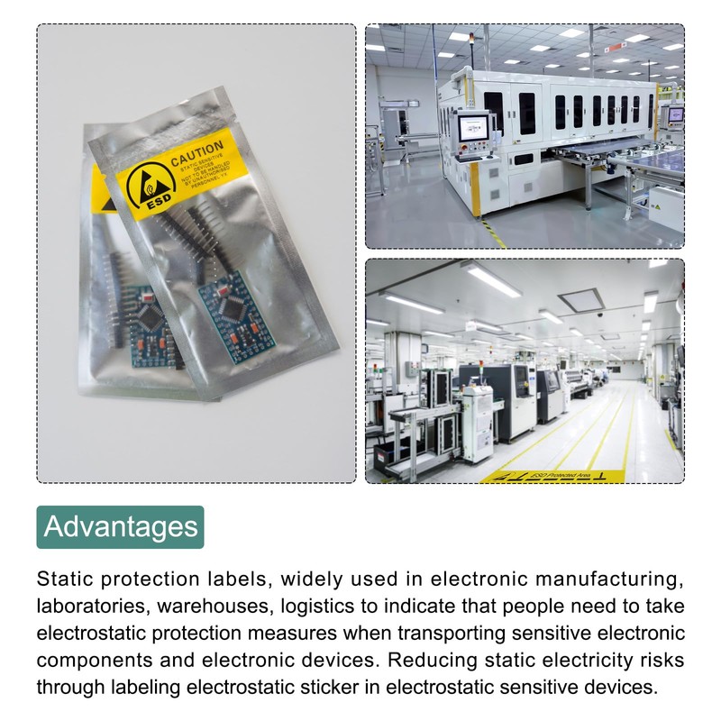 - ESD warning labels can serve as identification and reminders. Static protection labels, widely used in electronic manufacturing, laboratories, warehouses, logistics to indicate that people need to take electrostatic protection measures when transporting sensitive electronic components and electronic devices. Reducing static electricity risks through labeling electrostatic sticker in electrostatic sensitive devices