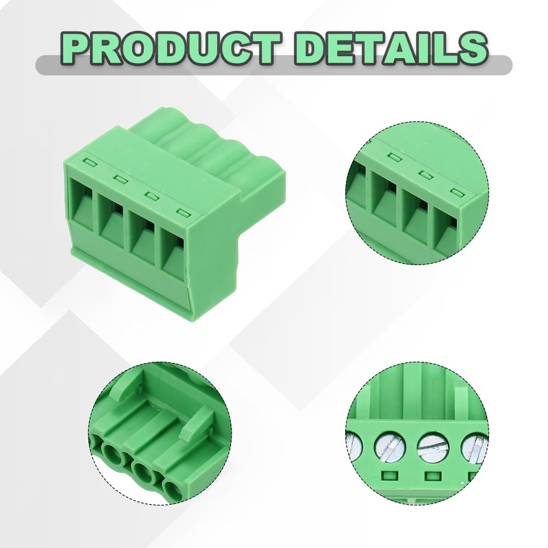 - Color: Green; Material: pure copper with tin plating; Terminal distance : 5.08mm/0.2Inch; Rated Value: AC 300V, 10A; 4 Pin Connector size: 20.32mm x 15.2mm x 18.8mm/0.8" x 0.6" x 0.74"(L*W*H); In the package of: 10pcs x 4 Pin Screw Terminal Block Connector