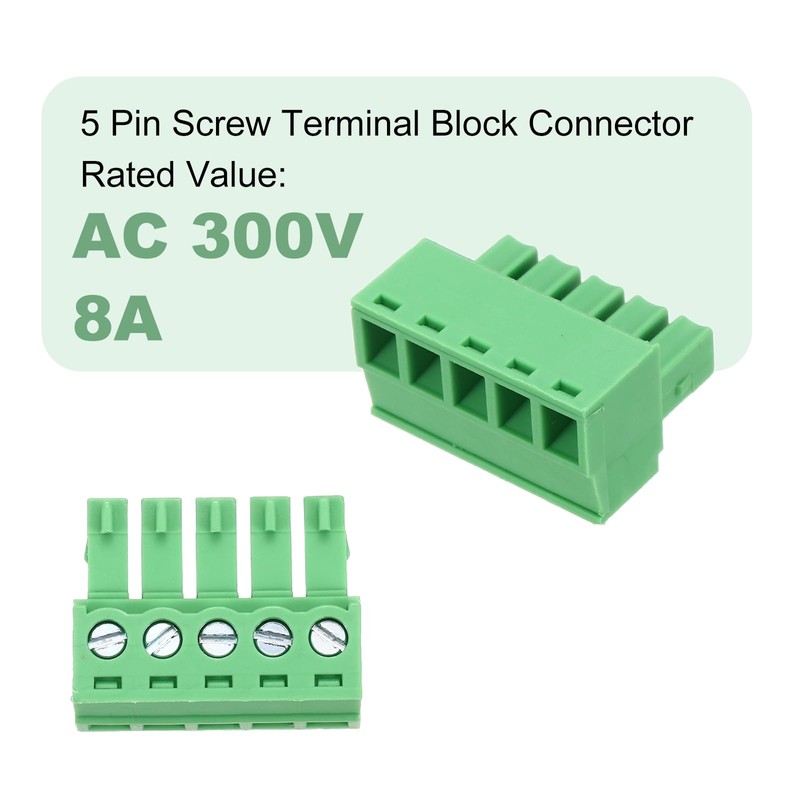 • Color: Green; Material: pure copper with tin plating; Terminal distance : 3.81mm/0.15Inch; Rated Value: AC 300V, 8A; 5 Pin Connector size: 19.85mm x 11.1mm x 15.5mm/0.78" x 0.44" x 0.61"(L*W*H); In the package of: 10pcs x 5 Pin Screw Terminal Block Connector