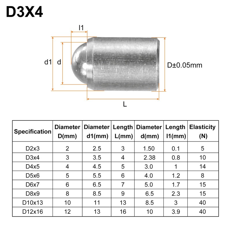 - Size - Body Diameter: 3mm / 0.12" (Diameter tolerance±0.05mm); Body Length: 4mm / 0.16"; Overall length: 4.8mm / 0.19"; Elasticity range: 10N; Surface roughness: Ra 3.2.