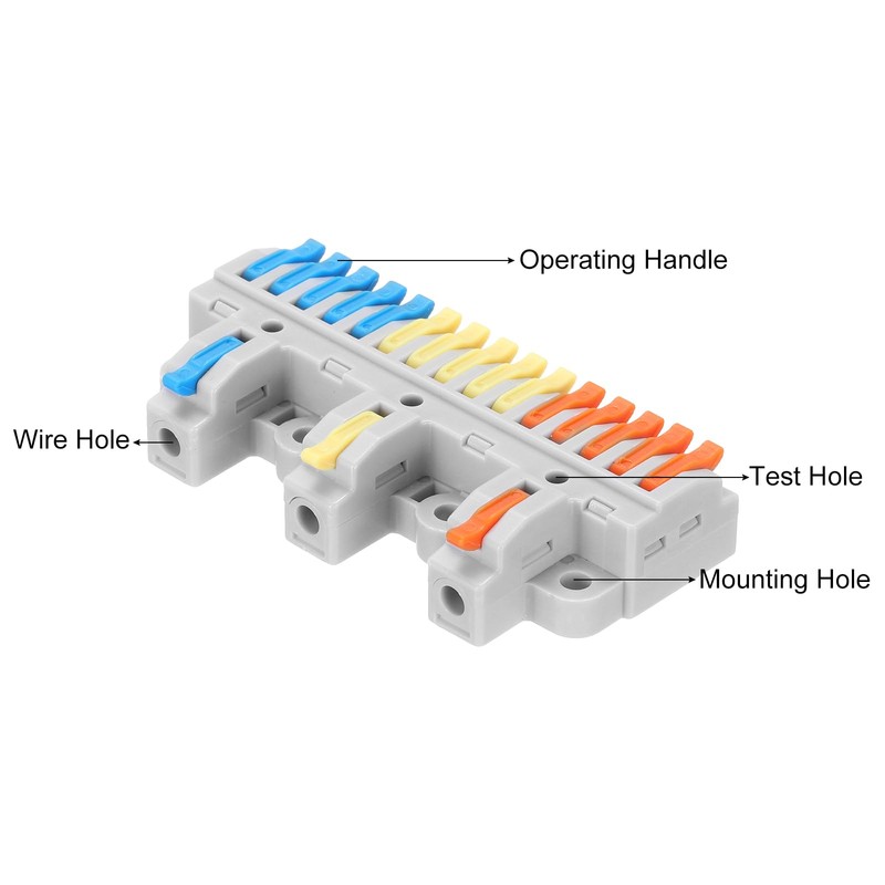 Din Rail Press Quick Terminal Blocks enables wires to be easily and securely joined together in a simple way, allowing users to easily open the handle of the connector, insert the wire into the colored metal contacts, and close the handle again to complete the connection.