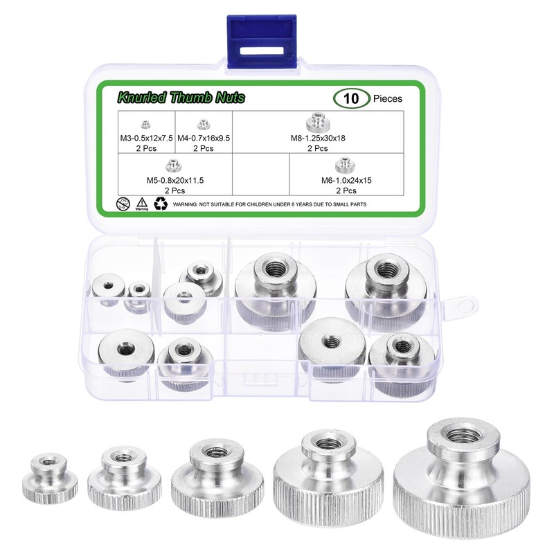 - Package Includes: You'll get 10pcs knurled thumb nuts, including 2pcs M3, 2pcs M4, 2pcs M5, 2pcs M6, 2pcs M8. All are packed well in a transparent box for easy storage and carrying.